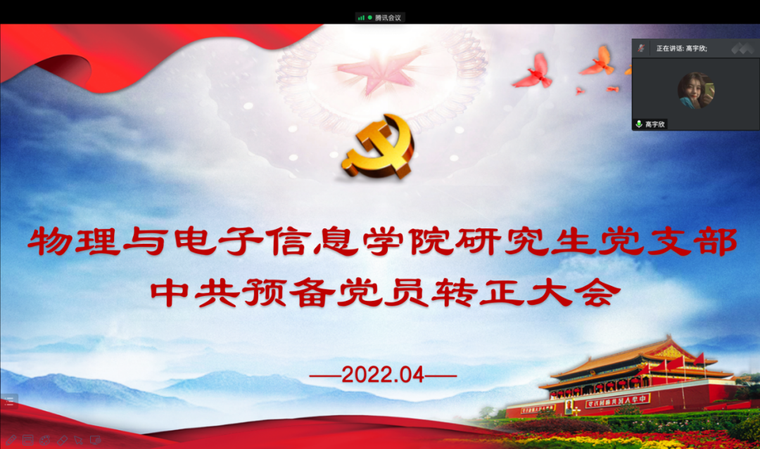 36365线路官网研究生党支部于4月19日在线上召开中共预备党员转正大会,大会由支部书记木其尔主持,讨论并表决了关于高宇欣,王华琛,王欣宁三名同志转为正式党员的相关事宜。