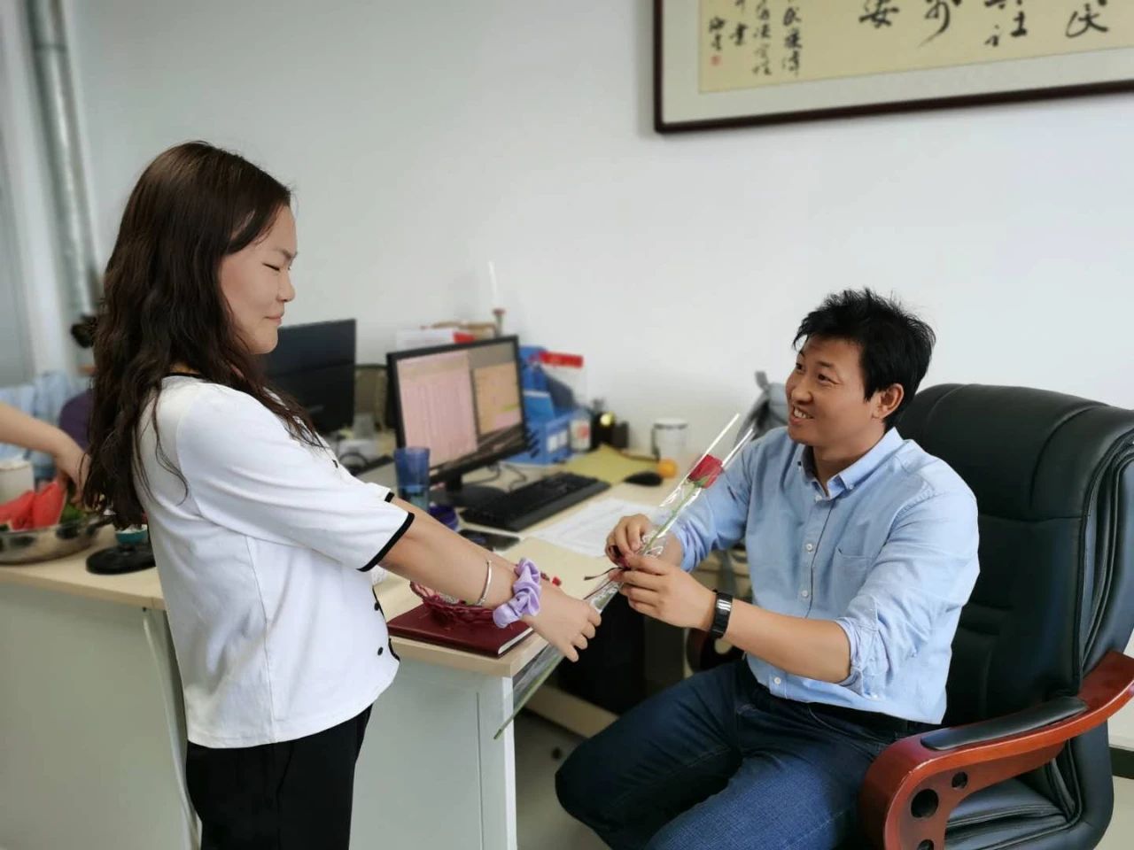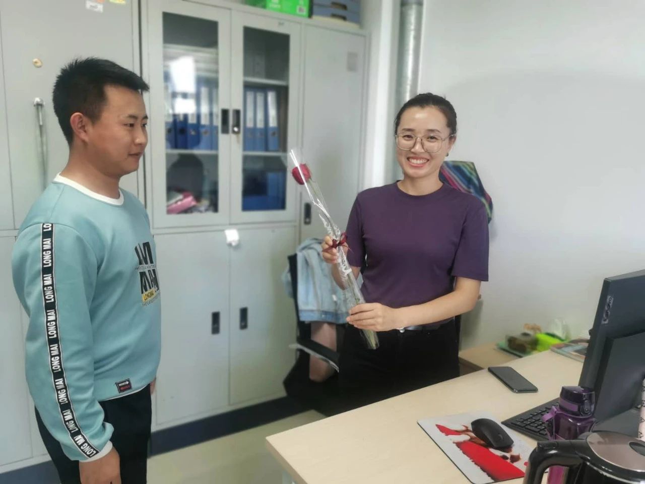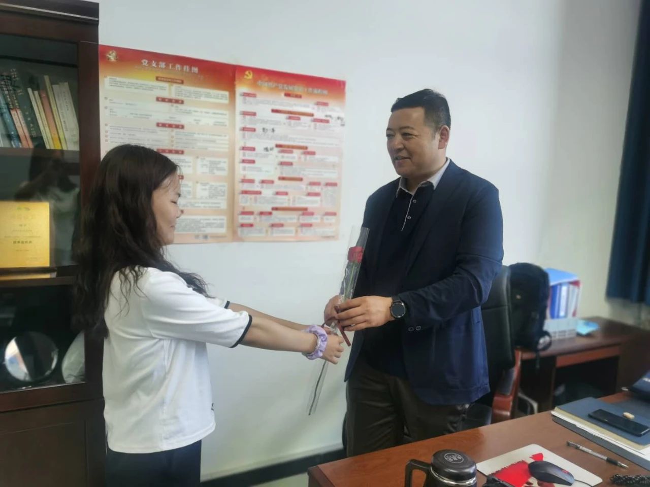 9月10日下午,党员同学们拿着准备好的鲜花亲自送到每一位老师的手里,并亲口对老师说出“教师节快乐”。一句句“教师节快乐”抚慰了老师们的心,这不仅是对老师们日日夜夜辛勤工作的肯定,也是对老师们默默付出之后的温暖回应。在收到同学们的鲜花后,老师们深表欣慰,在第一时间感谢大家的用心准备,同时回赠寄语:“希望同学们努力学习,贯彻党的宗旨积极为同学服务,发挥党员的先锋模范作用,不辜负老师们辛勤教导与殷切希望。”