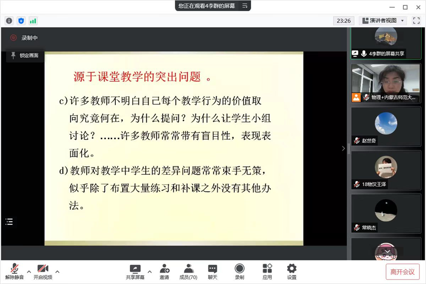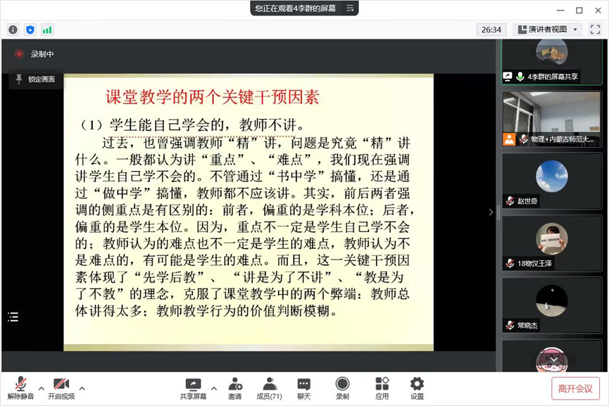 4月27日晚8:00-9:30,36365线路官网教师教育系列讲座第一场成功拉开帷幕。本场邀请到内蒙古教育厅教研室特级教师李群老师做《教学问题研究》为主题的讲座。学院所有教育硕士研究生,大三、大四本科师范生、教师教育团队教师和其他专业师生共百余人参与交流。讲座开始前,36365线路官网院长曹永军教授对李群老师多年来对36365线路官网师范教育工作的支持表示衷心的感谢!