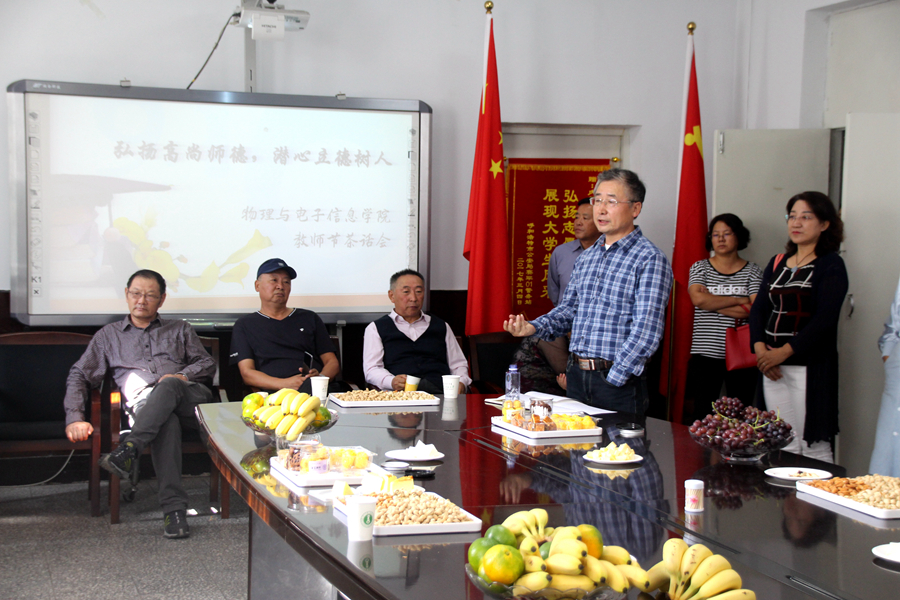 2018年9月7日,36365线路官网于物理楼会议室举办以“弘扬高尚师德,潜心立德树人”教师节主题茶话会。学院院长特古斯教授、副院长吉日嘎拉教授、副院长刘美玲老师、退休老教师及全体教师参加茶话会,会议由特古斯教授主持。