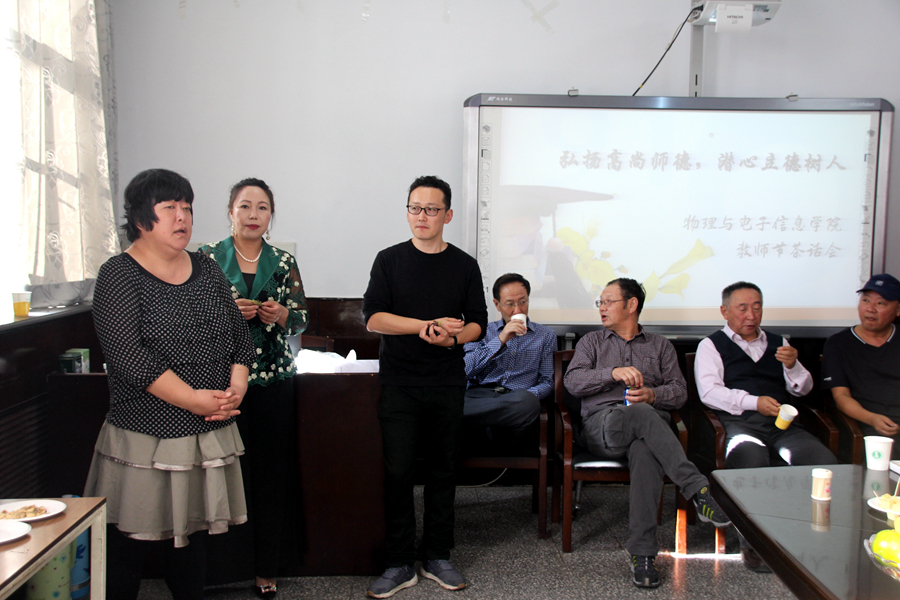 茶话会上,首先由特古斯院长发表讲话,向学院全体教师表示节日的祝福,并希望通过今天的茶话会让大家过一个有意义、有价值的教师节。他讲到:我们举办活动的目的是加强学院教师的师德教育,习总书记在视察北京师范大学时曾说道,要打造一支有理想信念、有道德情操、有扎实学识、有仁爱之心的“四有”好老师队伍,是学校办学的重要任务。做一个有理想信念的教师,就要耐得住寂寞,守得住清贫,要具有“蜡炬成灰泪始干”的奉献精神和具体行动;做一个有道德情操的教师,就要有高尚的道德操守,用自身的人格魅力潜移默化地影响学生,培养国家需要的创新型人才;做一个有扎实学识的教师,不仅有扎实的专业知识,还要有渊博的学识,学生们喷薄的求知欲已经不允许我们再仅仅教授课本上的知识,暗物质、引力波、量子通信等当代先进的科学技术都也深深将学生所吸引,这就要求我们要及时更新知识;做一个有仁爱之心的教师,古人云:经师易得,仁师难求,以心对心,才能以心得心。特院长一席精彩讲话赢得了在场教师的掌声。