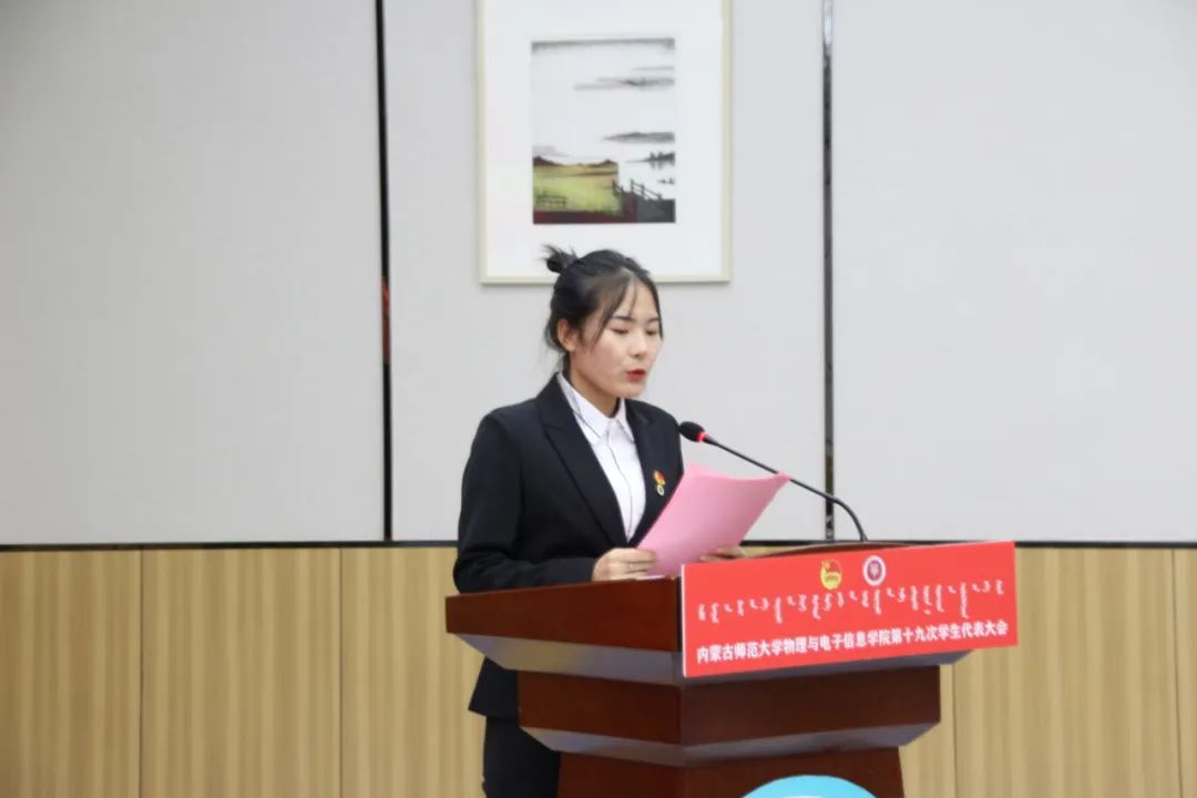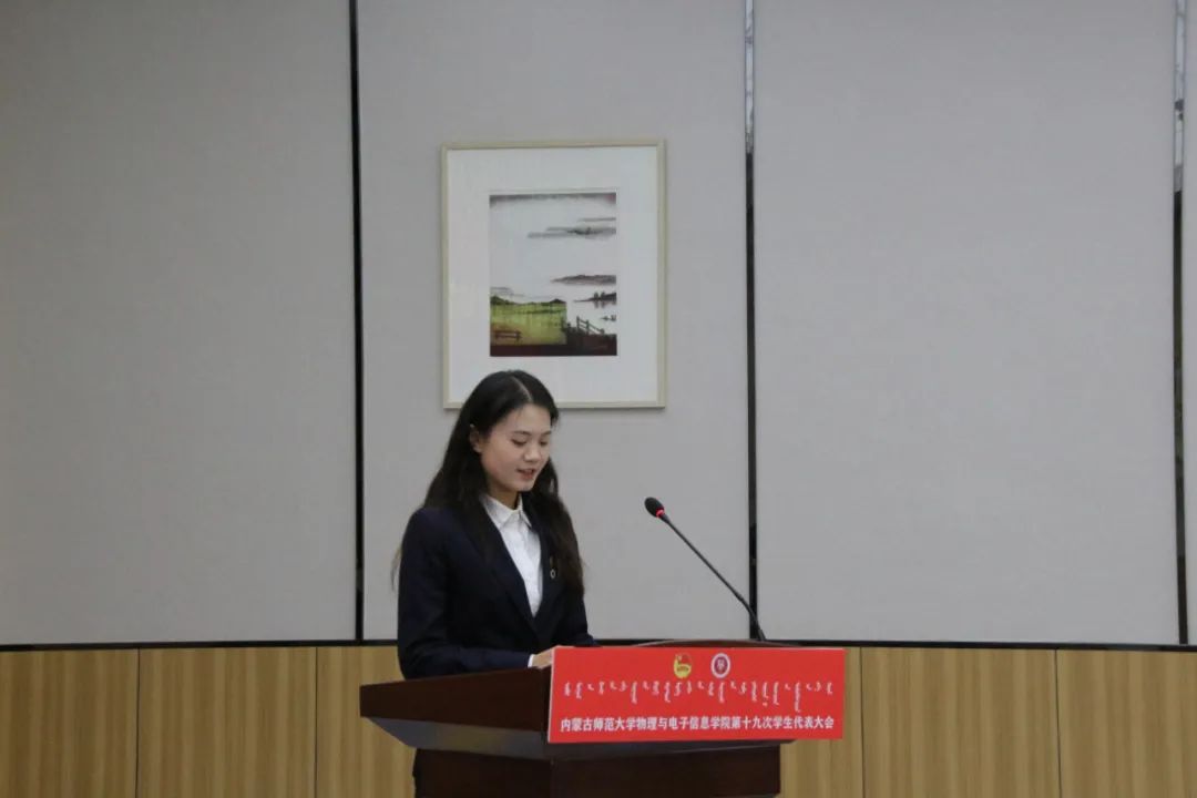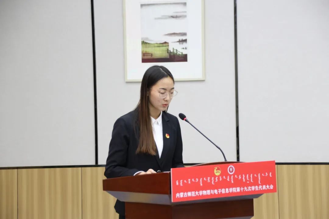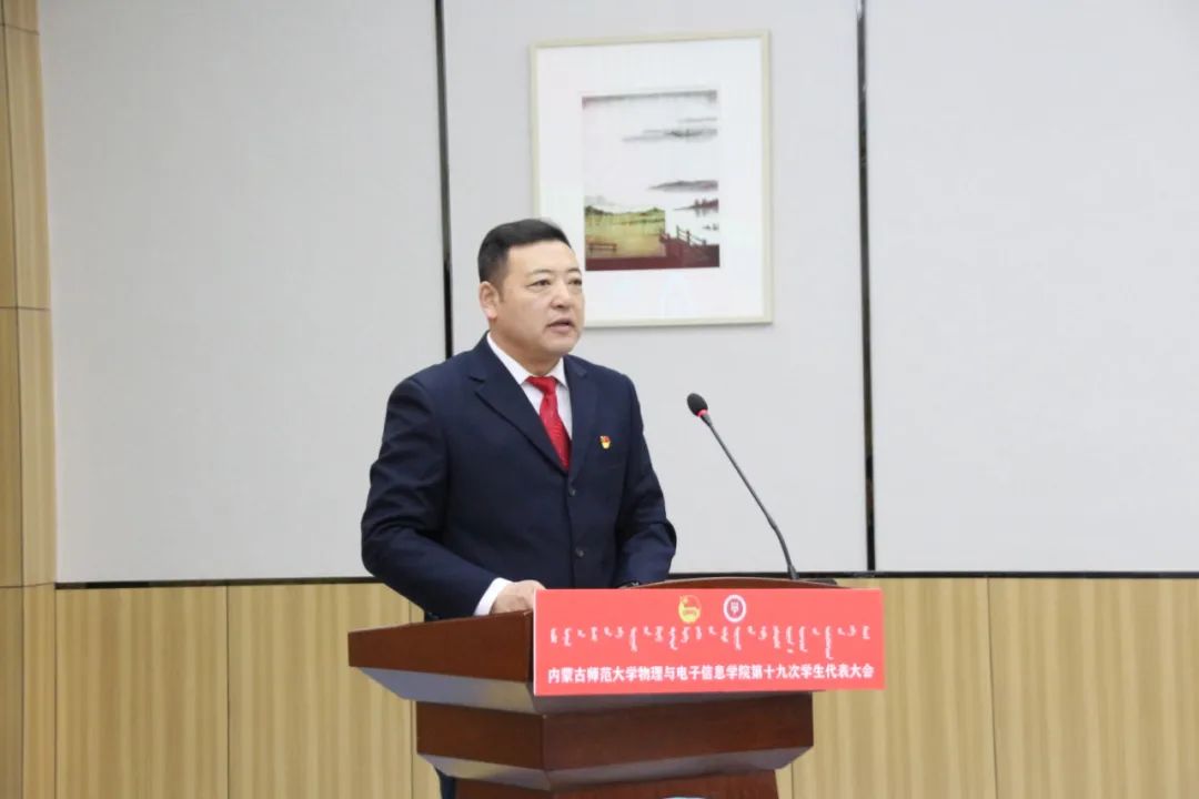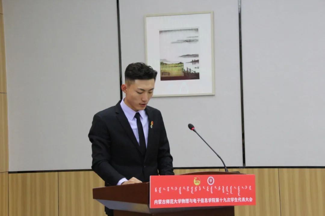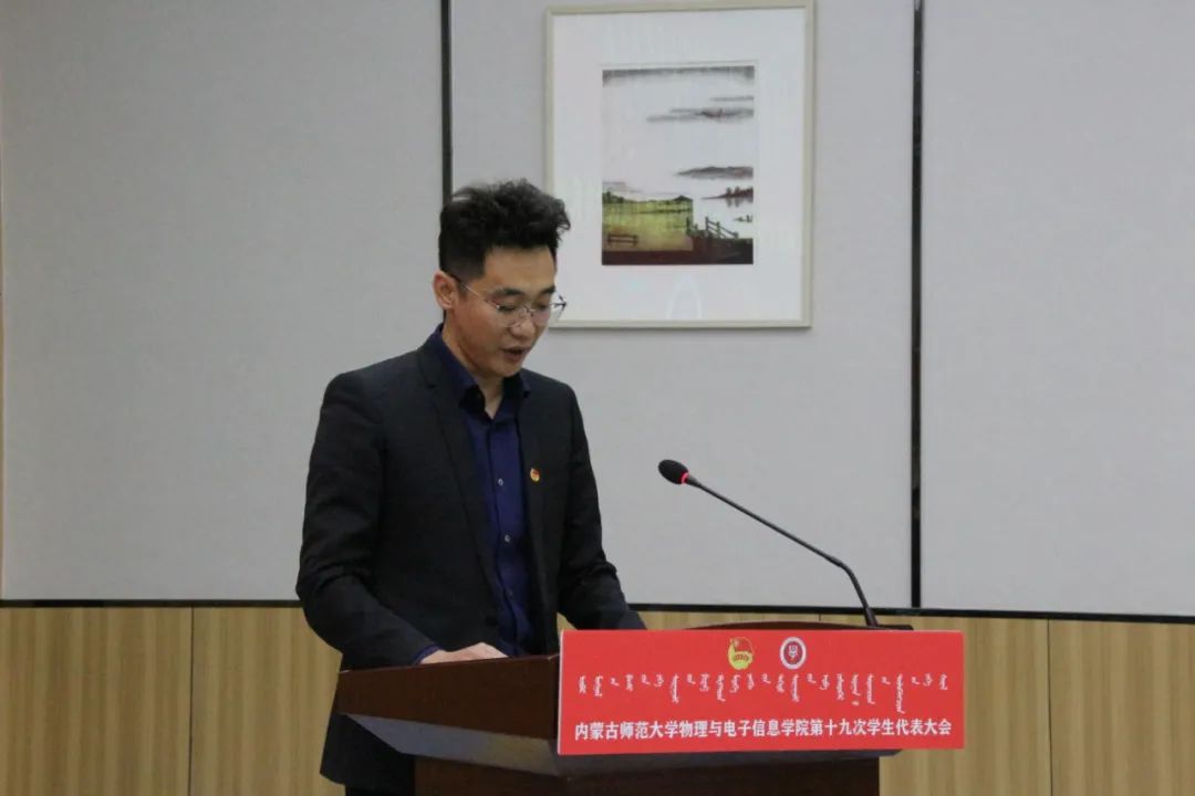 校团委青年发展部副部长孟伟东老师代表校团委首先对36365线路官网团学工作给予了充分肯定,其次从坚定理想信念、培育高尚品格,、练就过硬本领三个方面向36365线路官网广大青年学生提出了建议和希望。他希望,青年学生代表在团组织的带领下,以此次学代会为契机,紧跟中国共产党的脚步,不忘跟党初心,坚守青春使命,在新中国前进的道路上展现内蒙古师范大学物理与电子信息学院的风采。